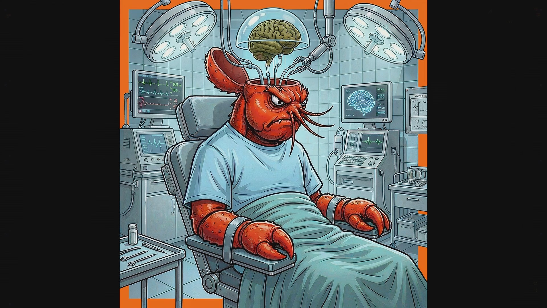 Cartoon lobster in a medical operating room with brain scans and monitors.